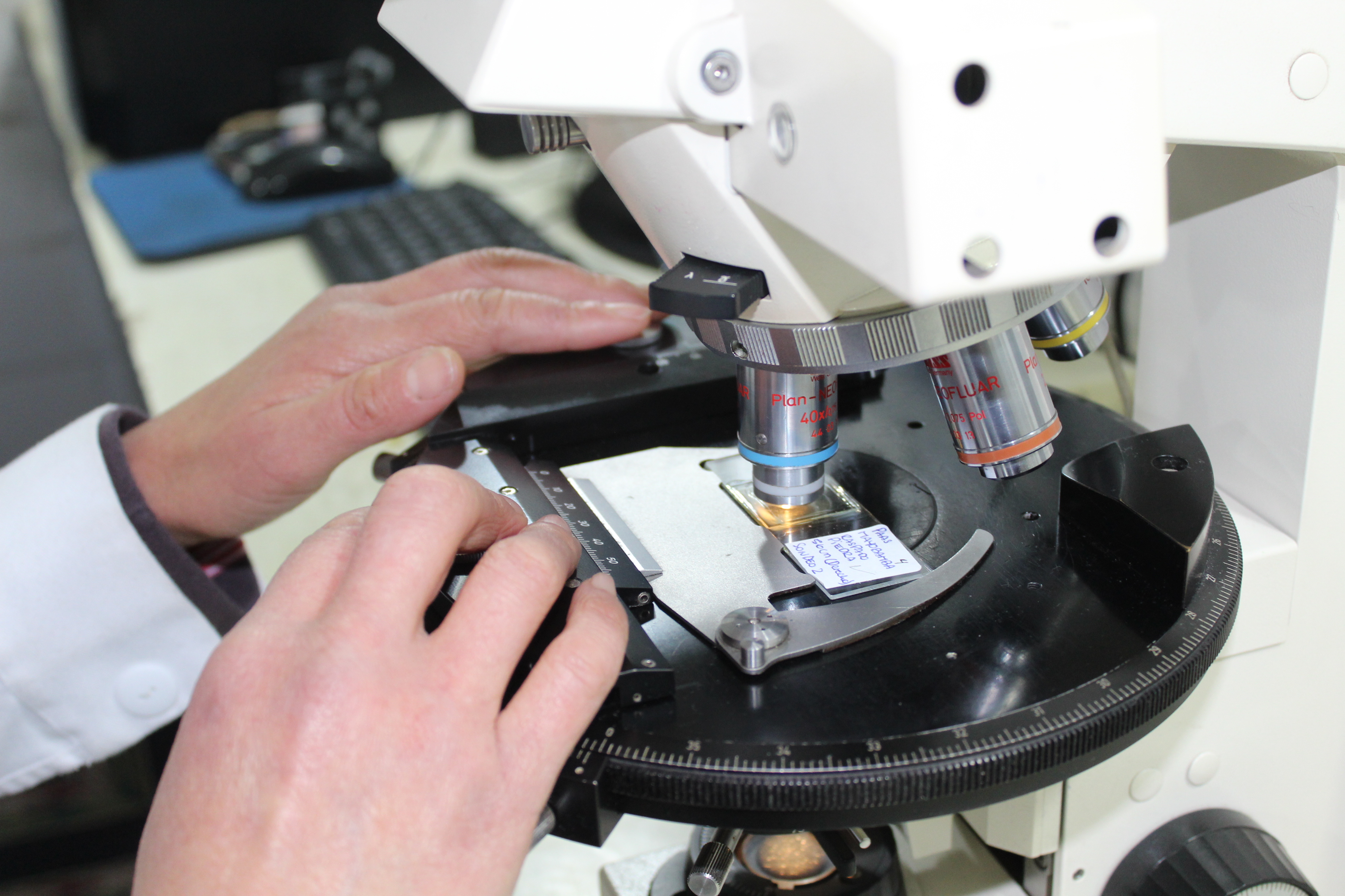 En el área de microscopía, a cargo de Burgos, se observan, caracterizan, fotografían, cuantifican distintos grupos de microfósiles: silicofitolitos, calcifitolitos, diatomeas, granos de almidón, granos de polen, microcarbón, anillo de celulosa, esporas de hongos, esporas de helechos, crisofíceas y espículas de espongiarios.
